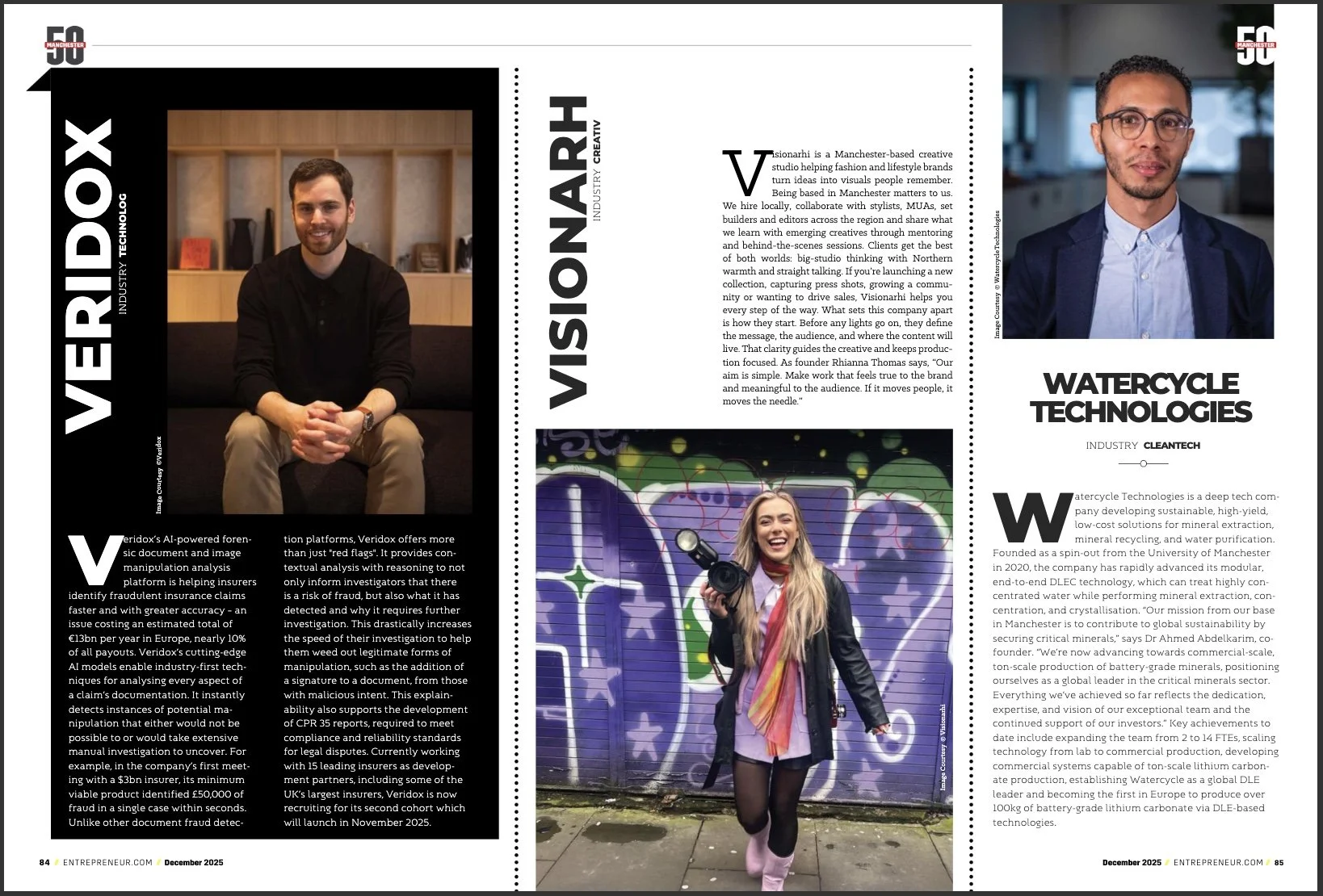 Watercycle Technologies and our founders Dr Sebastian Leaper and Dr Ahmed Abdelkarim have been recognised in Entrepreneur UK’s Manchester 50, a list celebrating the city’s fastest-growing and most forward-thinking businesses.